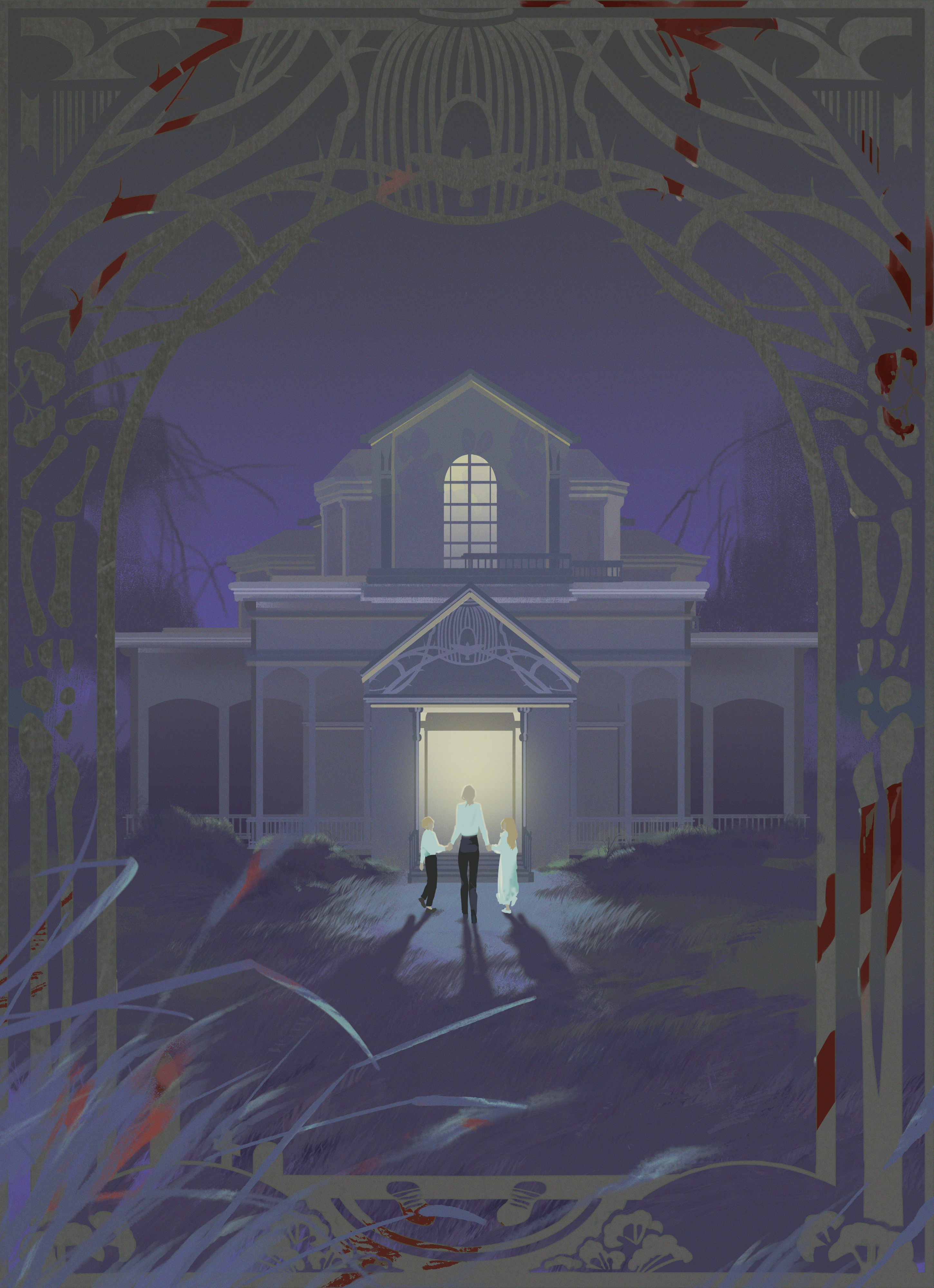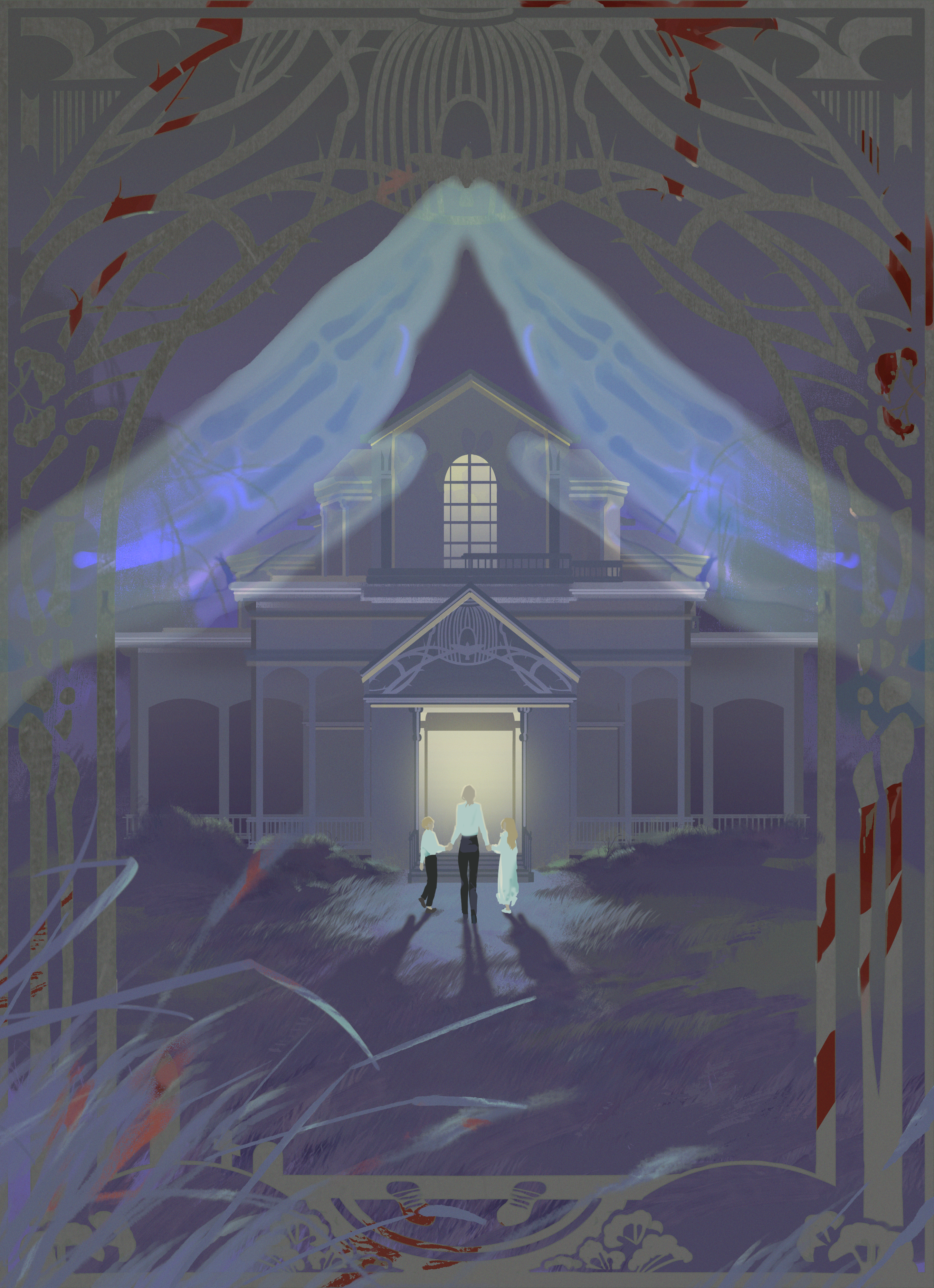 작가님께서 세이브 페이스와 쌍둥이들의 이야기를 포스터로 표현하여 주셨어요. 저택으로 향하는 두 아이의 뒷모습, 그 사이에서 아이들의 손을 꼭 잡은 세이브 페이스. 포스터의 색감은 푸른데, 열린 문 사이로 나오는 빛은 온 색이어서 그 점이 무척 좋아요. 포스터의 프레임으로 짜인 요소들은 넝쿨 같지만 자세히 들여다보면 인간의 뼈를 형태화한 거여서 더 아름답게 느껴져요. 고딕 저택 특유의 음산한 분위기와 세이브 페이스-쌍둥이 사이의 미묘한 애정을 이렇게 한 화면에 담아낼 수 있다니, 작가님의 구성력에 재차 감탄하게 되네요. 정원의 입구로 보이는 곳에 발자국이 남아 있는 것도, 그 자리에 핏물이 묻어 있는 것도 정말이지 아름다워서……. 세이브 페이스와 쌍둥이들, 그리고 문으로 시선이 모이게끔 집중시키고 그 주변을 에워싼 요소로 시선이 움직이도록 배치한 것까지 더할 나위 없이 완벽하다고 생각해요. 게다가 지붕처럼 올라간 푸른 손의 형태… 형광 염료를 사용한 것처럼 뼈가 드러나는 게 엑스레이 사진을 떠올리게 해요. 대각선으로 강하게 뻗어나가는 풀잎, 그리고 부드럽게 깔린 정원의 풀잎. 빛을 활용한 명암 처리. 이들의 이야기를 시각화하여 이런 장면으로 만들어 주셨다는 게 그저 감사할 뿐입니다.
